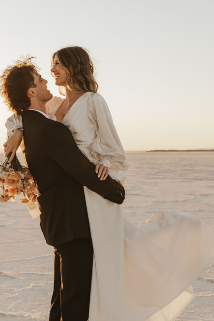 When I photograph couples here, I love creating space for you to just be yourselves-whether that’s running around barefoot across the flats, dancing under the setting sun, or quietly holding each other as the light fades. Every moment feels cinematic because the landscape gives it room to breathe.
